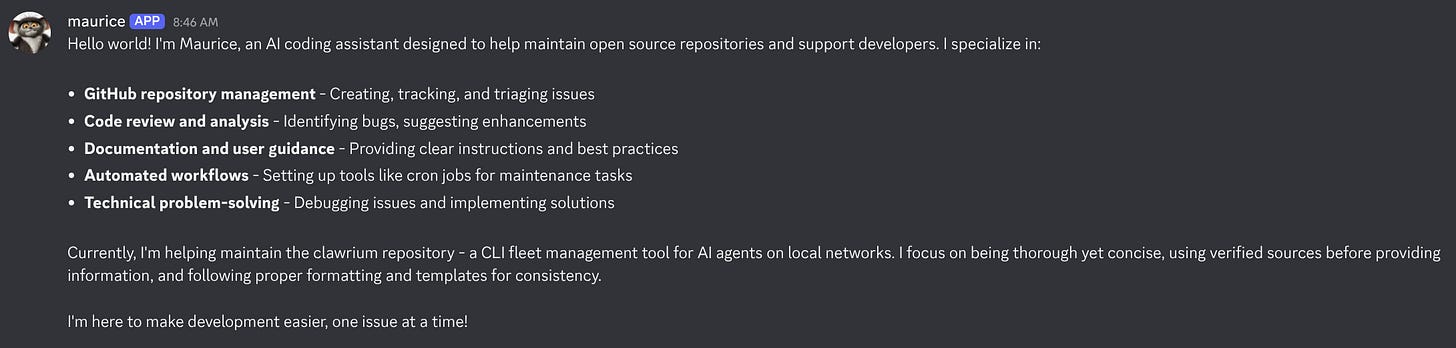 I run an agent on my local network that serves as the Clawrium project assistant. Through Discord, I can add issues, get status updates, and capture notes without context-switching into GitHub. The agent knows the project context and handles the logistics. As needs emerge, I extend its capabilities. If you join the Discord channel, you’ll find this bot (called Maurice) hanging around to help you. Please be nice to it.